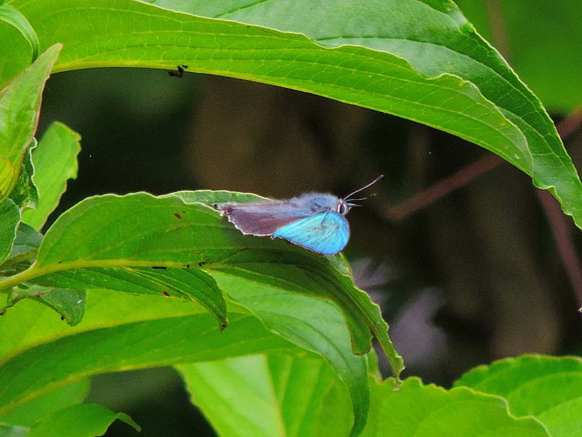 11月2日 晴れたり曇ったりの天気です。 今日は広い草地をゆっくりと、ほんとにゆっくりと歩きました。暑くもなく寒くもなくとても気持ちが良いです。草地の周りは、秋の景色となりとても静かです。草地の入り口に戻ってきたところに ウラナミシジミ が居ました。