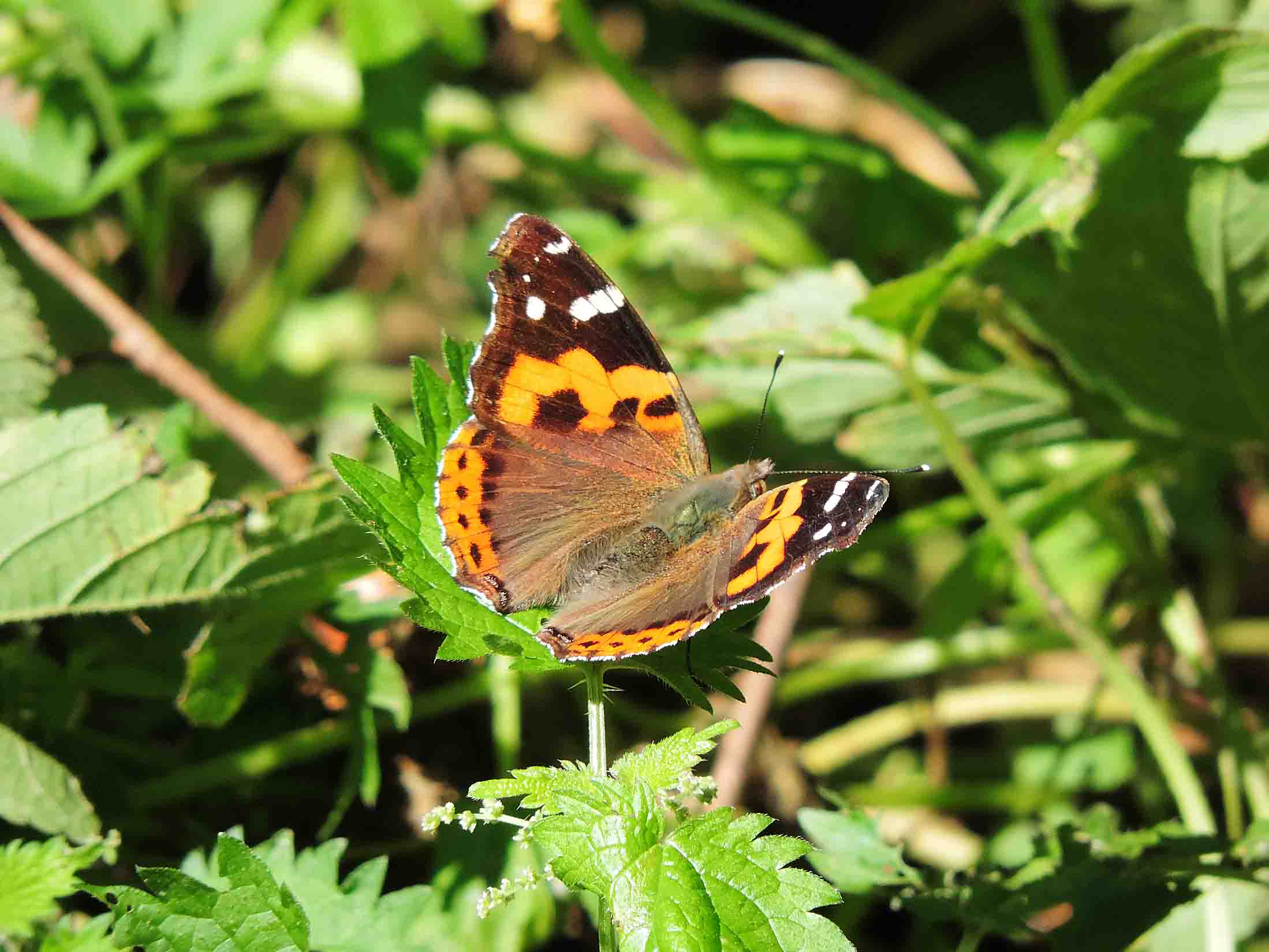 今、よく出現するムラサキシジミを見に行ったところ、近くに アカタテハ が飛んできました。