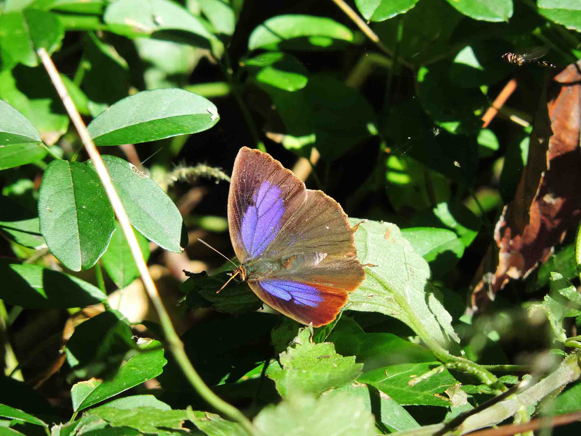 林の中に入ると風がなく、太陽が届く葉の上に ムラサキシジミ が日光浴をしていました。