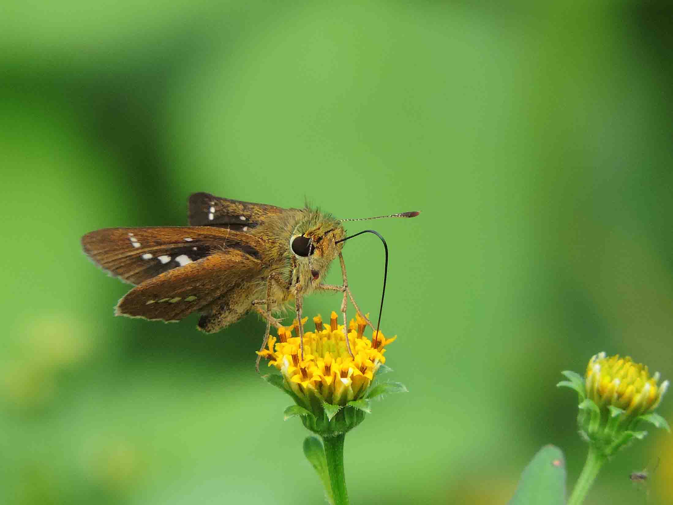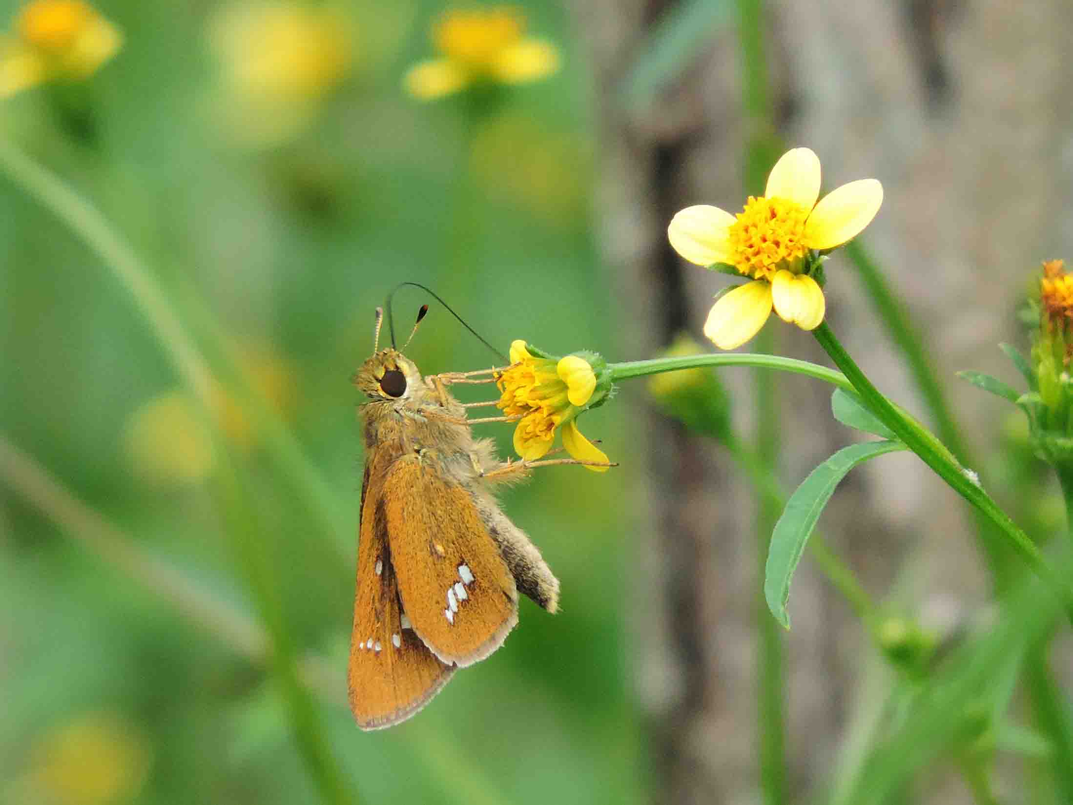 この林周辺で、咲いている花はセンダングサくらいです。そのセンダングサに活発に飛んでいるのが、イチモンジセセリ です。