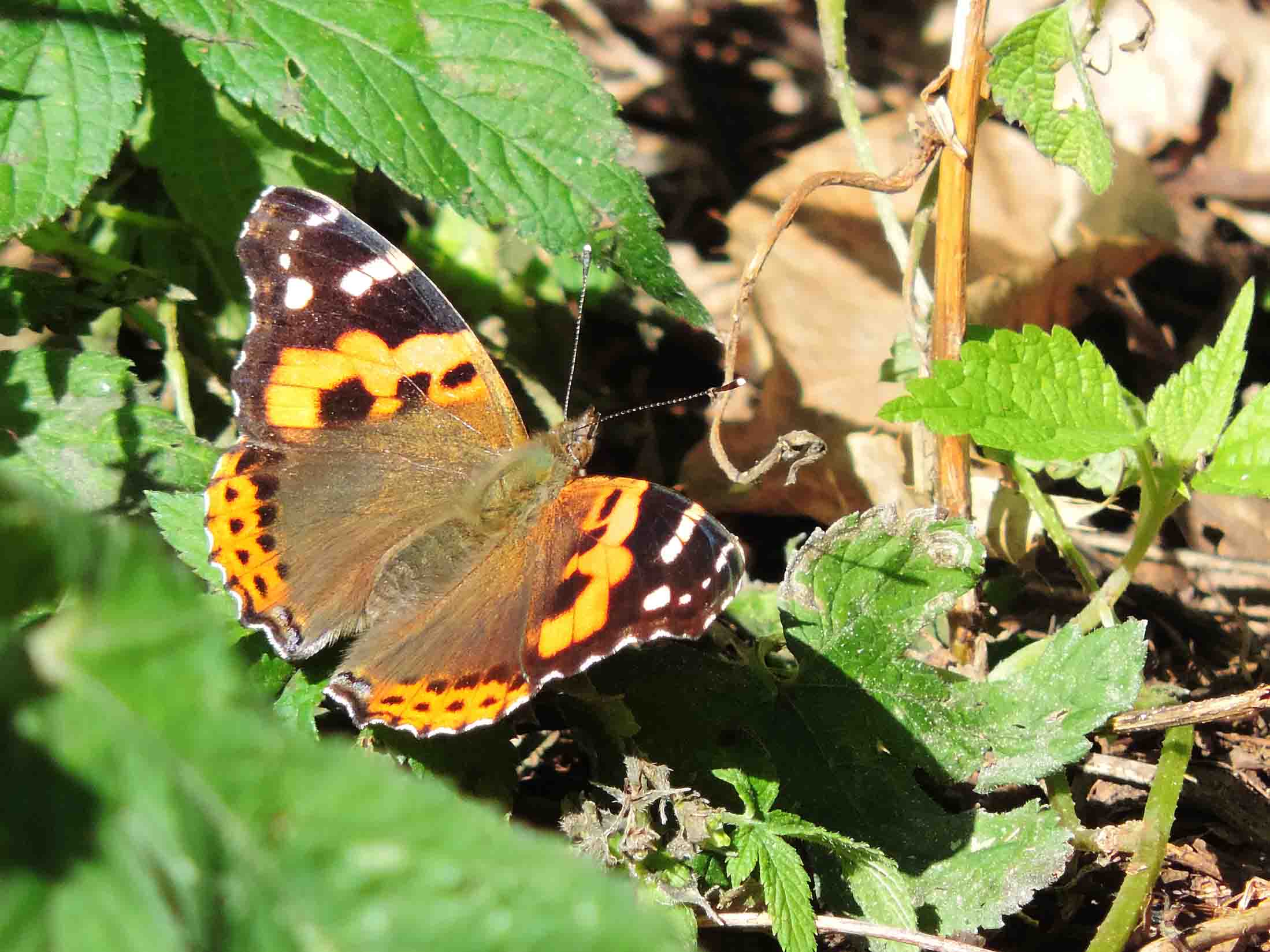 林の中に、ぽっかり空いた広場のようなところに、アカタテハ が2頭居ます。アカタテハは、産卵の場所を探しているように草の中にもぐる動作を繰り返しています。そして、葉の上で羽を広げたり飛んだり活発に行動していました。