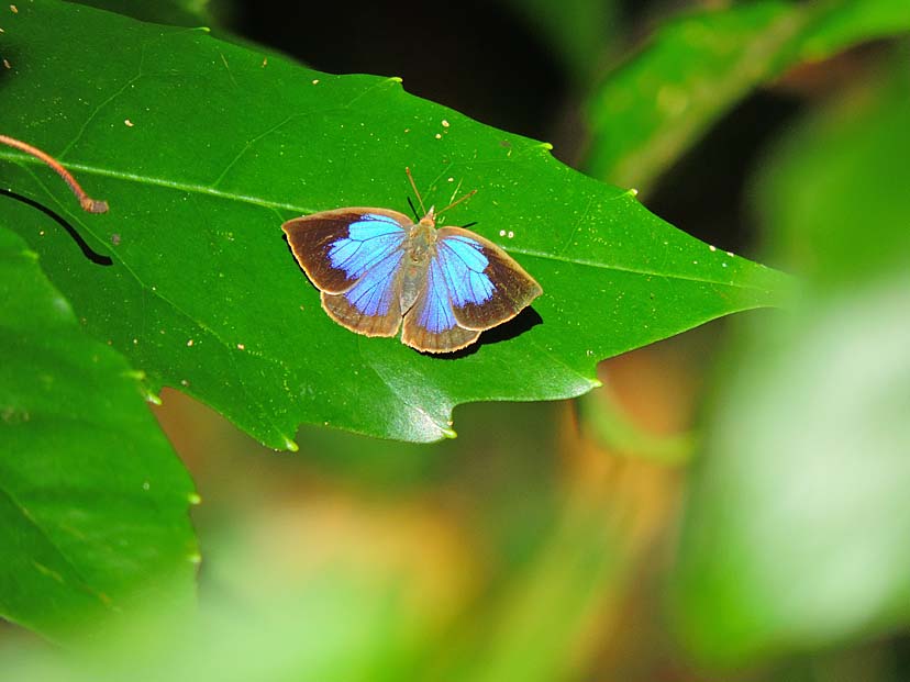 12月2日 林の中を歩くと、積もったクヌギ等の落ち葉が音をたてます。遠くから聞こえる鳥の鳴き声と落ち葉の音が心地よく感じます。暖かい陽だまりの中に ムラサキシジミ が現れました。