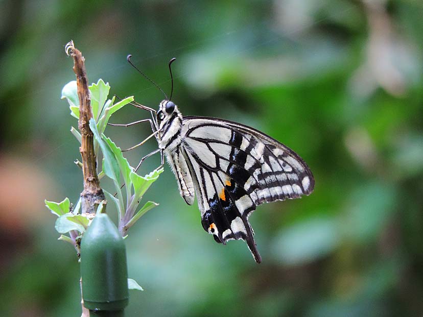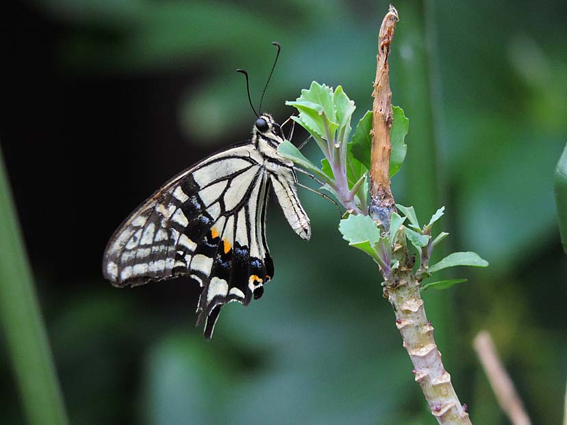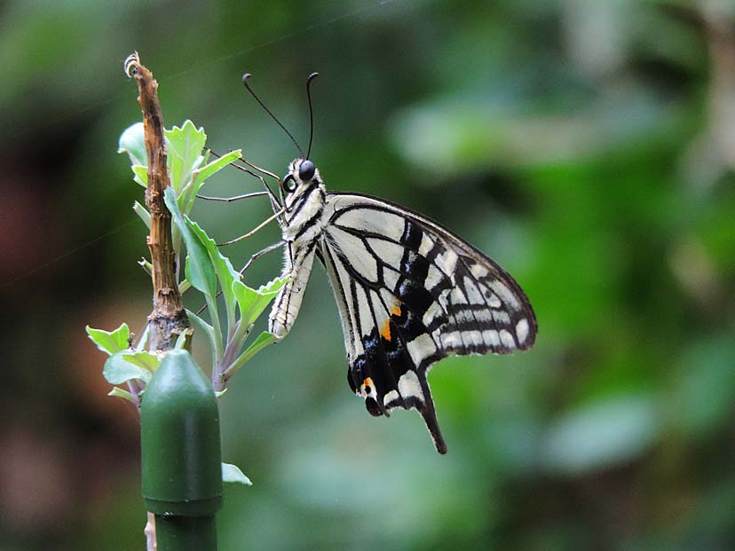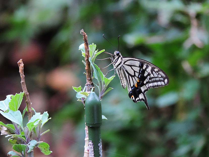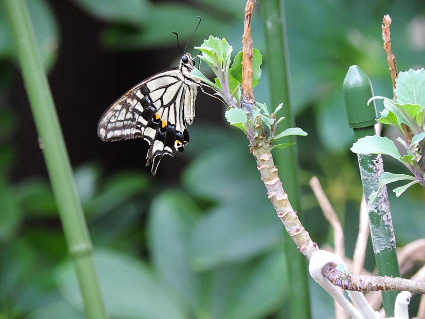 10月9日 台風22号が、八丈島付近を通過して間もなくの9時過ぎ、我が家で アゲハ がじっとしていました。風弱く、どんよりとした曇り空で、天気の回復を待っているようです。そして、いつの間にか居なくなりました。