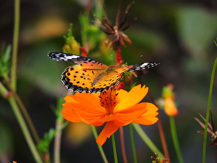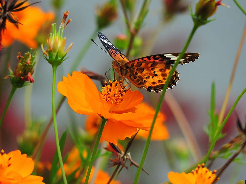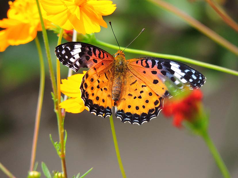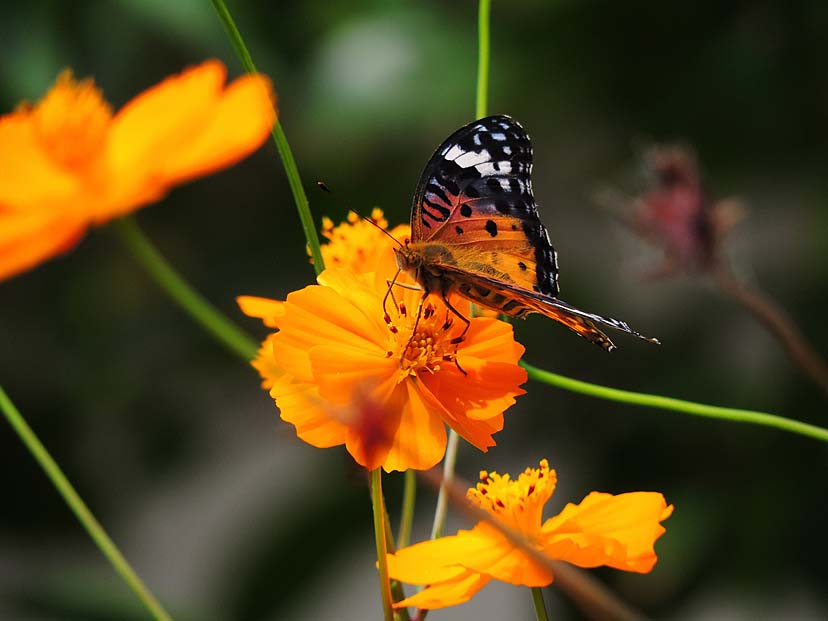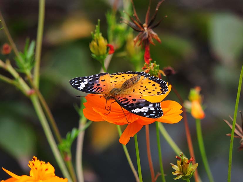 10月13日 台風23号が、再び、八丈島付近を朝方通過しました。その影響で、朝から曇り空です。 我が家に ツマグロヒョウモン が花に来ていました。