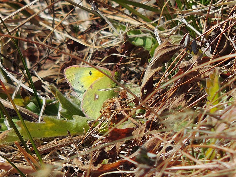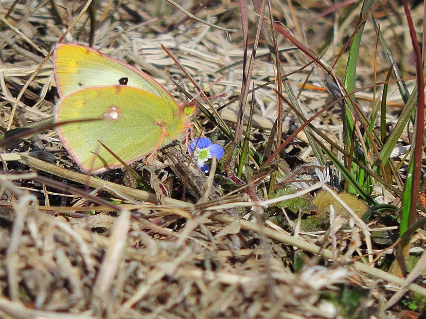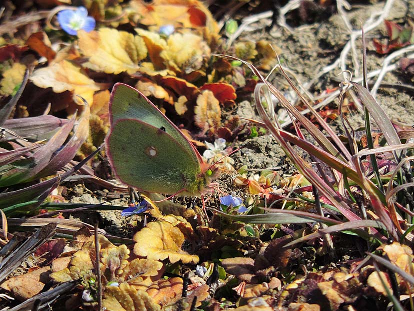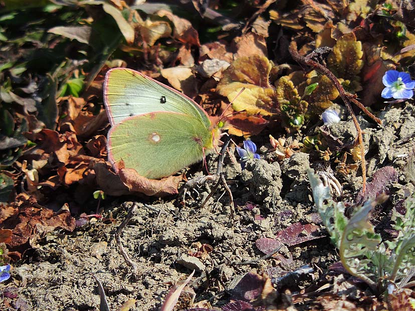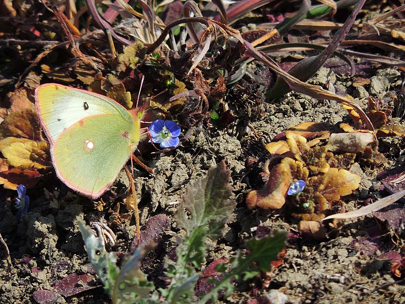 2月22日 用水路の土手に咲く オオイヌノフグリ や ホトケノザの数が増えて来ました。 広く続く田んぼの中を、一直線にのびる用水路の開放的な風景が気持ちよく感じます。 気温も暖かいので、 モンキチョウ が飛び続けています。