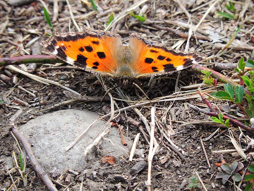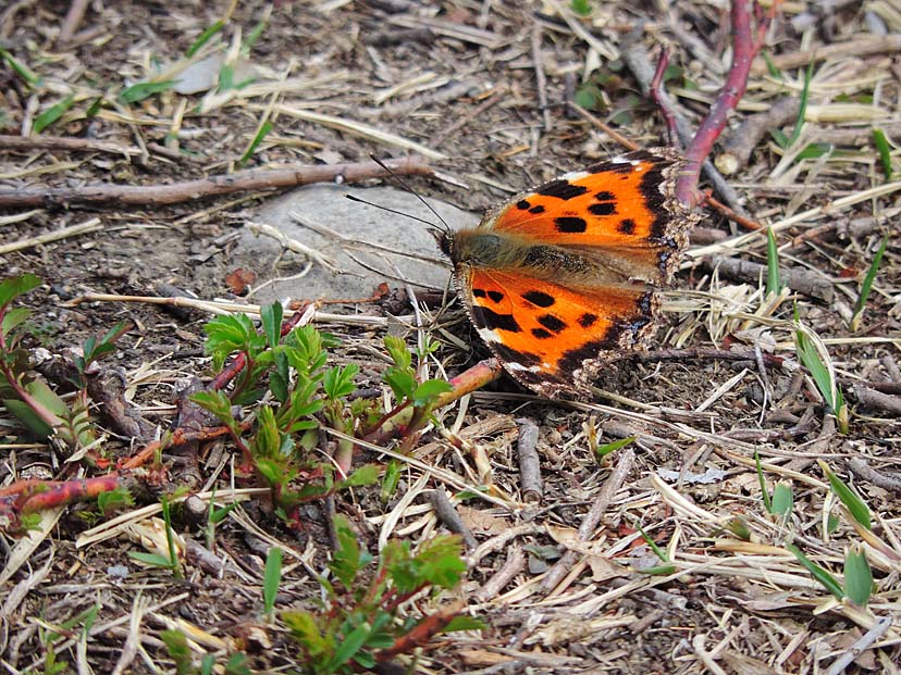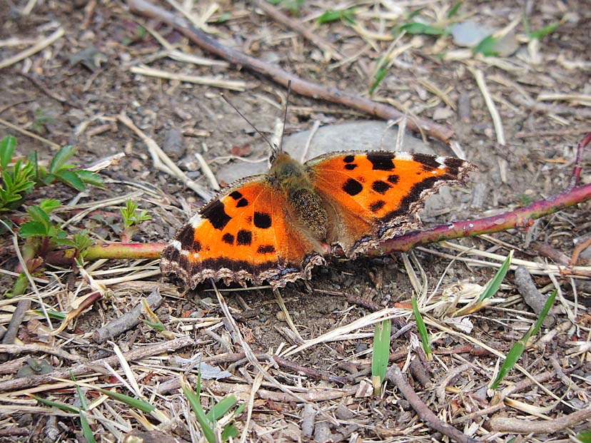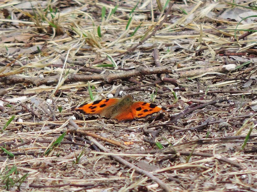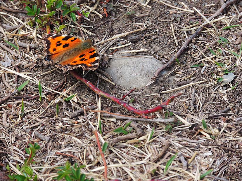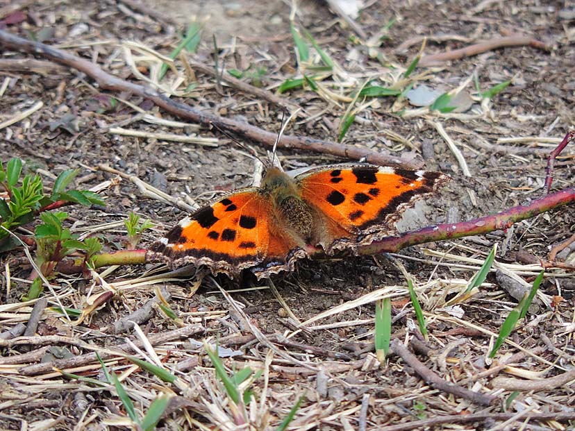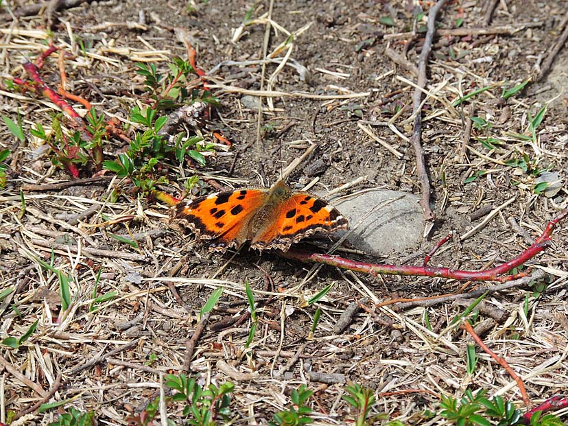 3月19日 北西の風が強く吹いています。 林を出た南側の遊歩道は、風も弱く暖かです。そこに ヒオドシチョウ が翅を広げていました。