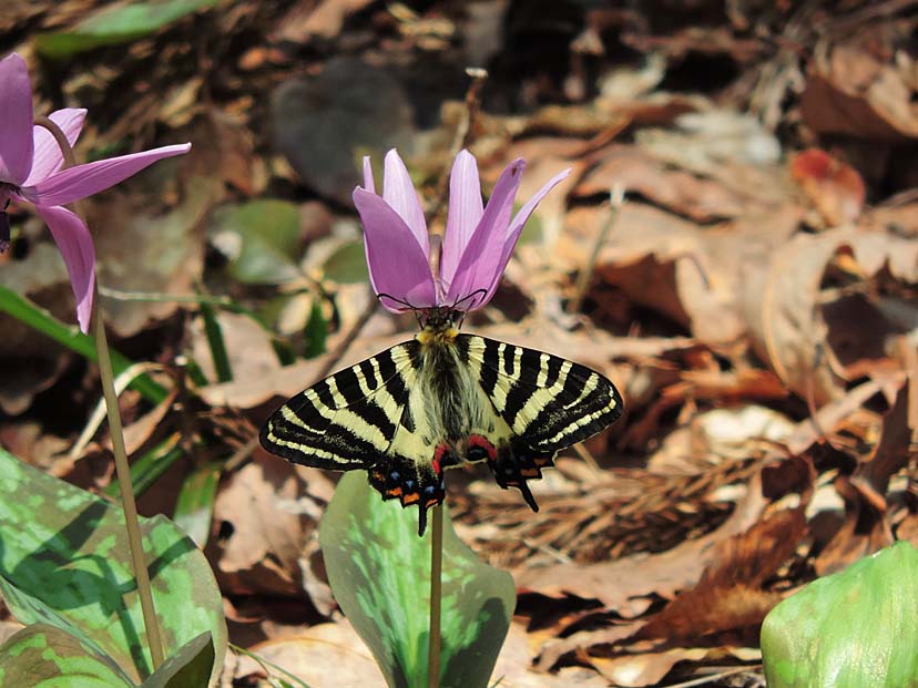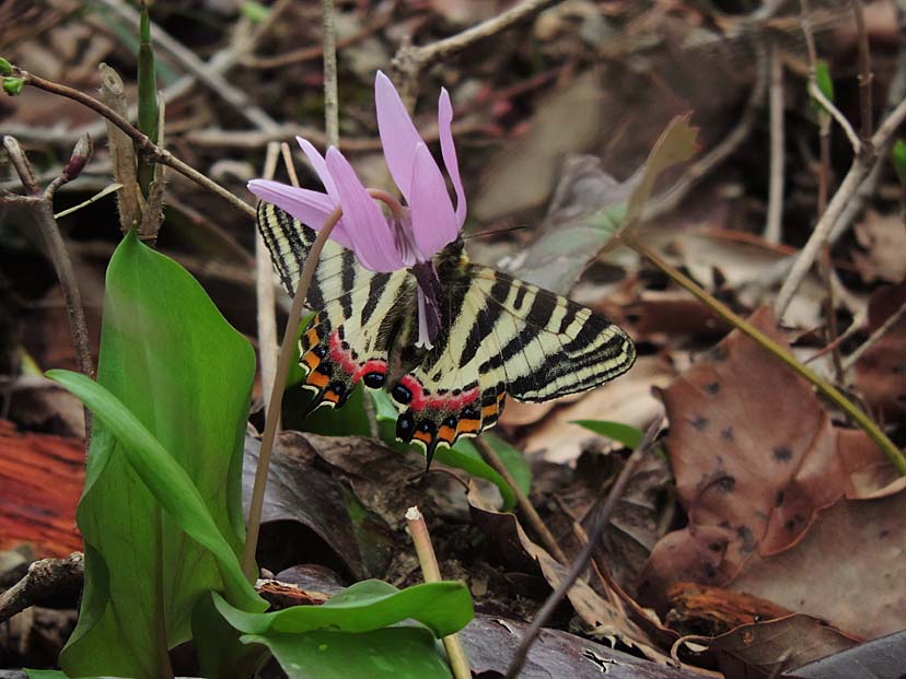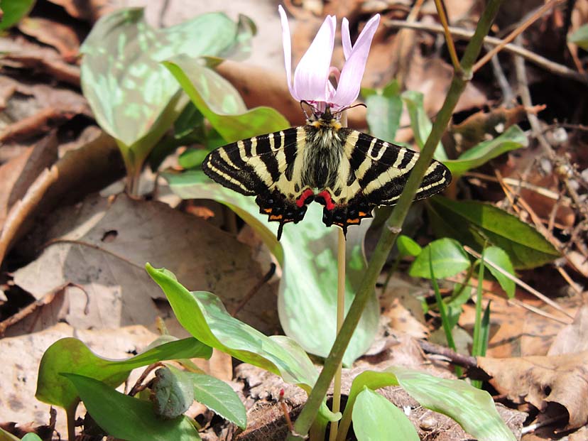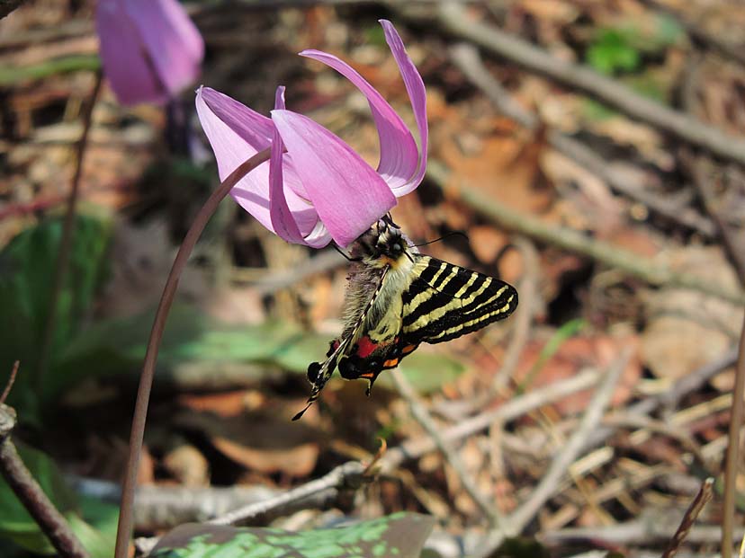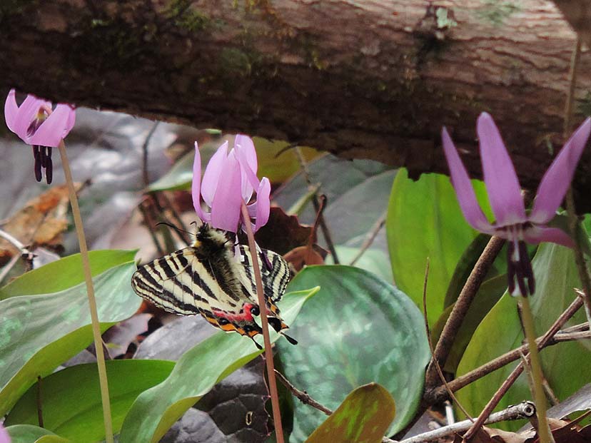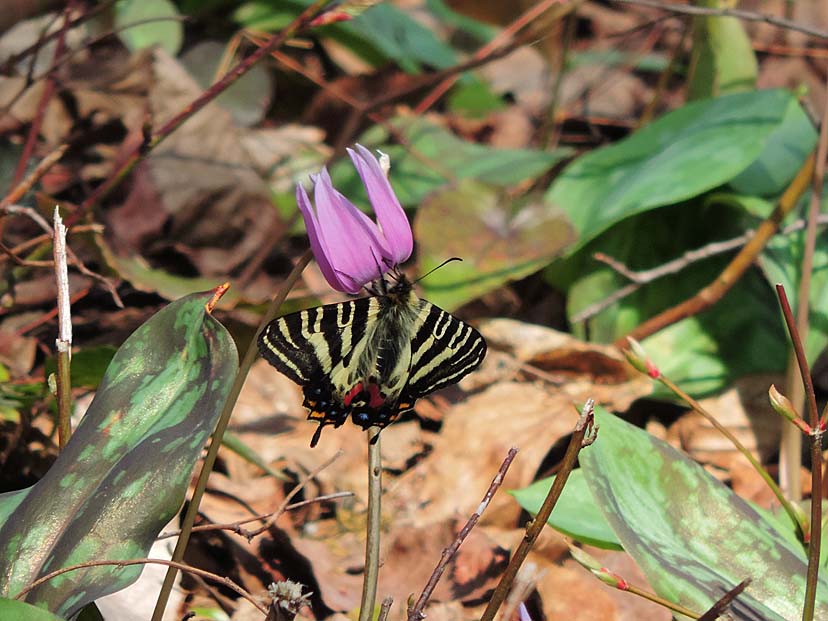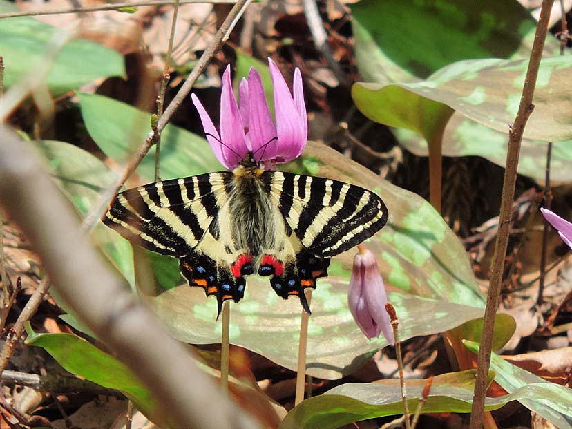 4月3日 午前中は、少し雲が出ましたが、その後は風もなく良い天気になりました。 カタクリの花もきれいに咲いています。 その花に ギフチョウ が飛んできます。 その数も思ったより多く、楽しく撮影が出来ました。 この場所まで車を運転していただいた Y.Sさんに感謝です。