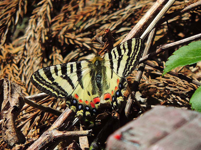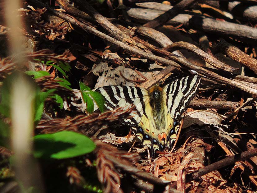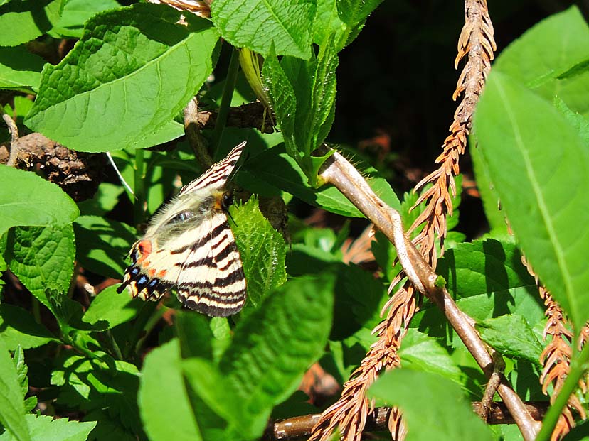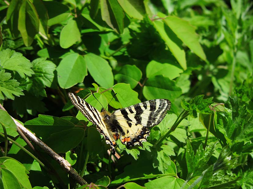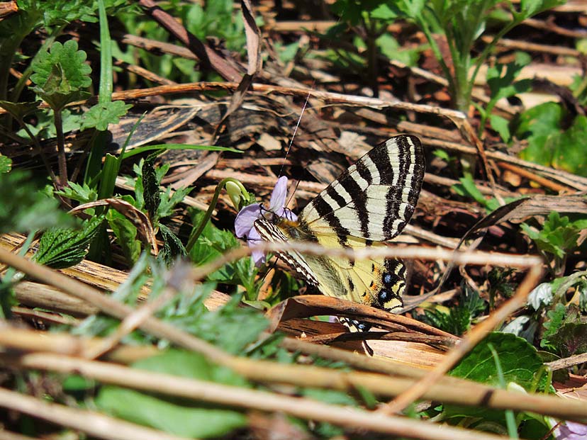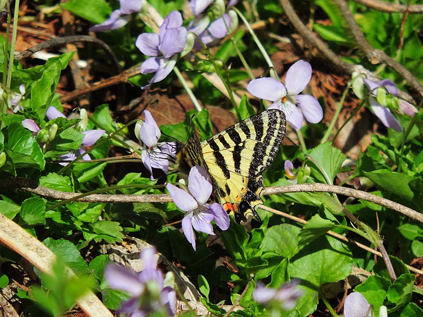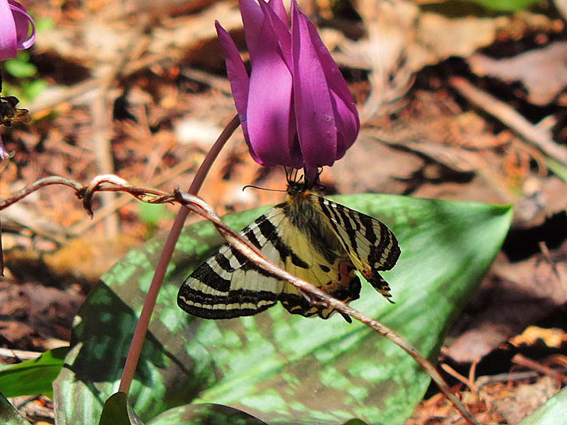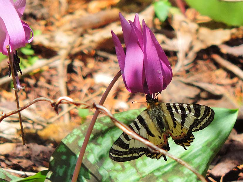 4月25日 北アルプスの連山には、雪が残っていてとてもきれいです。 現地に着くと少々肌寒く感じます。 ヒメギフチョウ はスミレの花に飛んできました。 しかし、スミレの花の蜜は少ないのか、止まってもすぐに移動してしまいます。