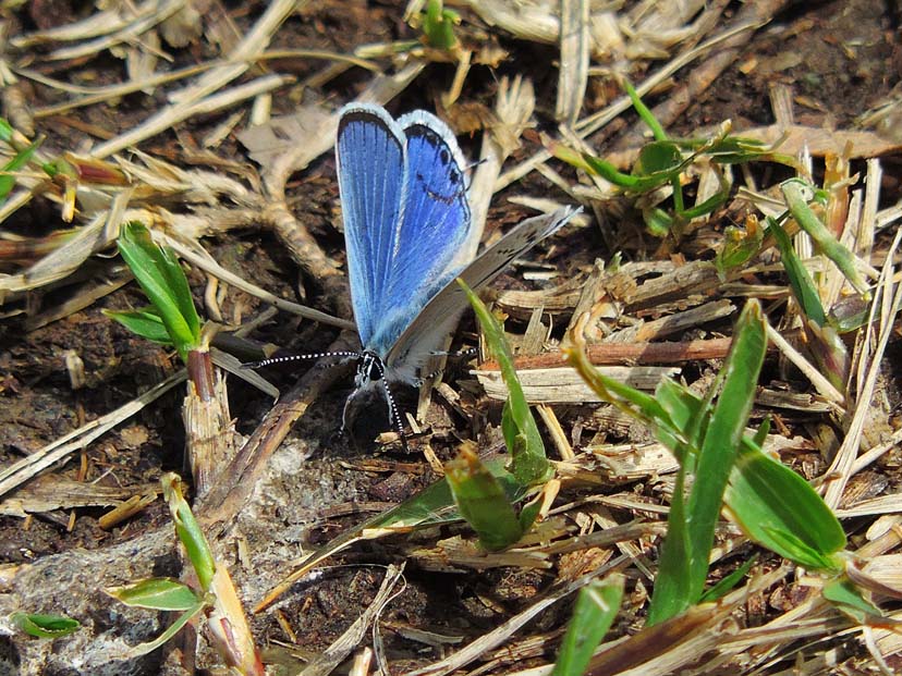 4月8日 いつもの林に行きました。草地を歩いていると、小さな ツバメシジミ が足元に飛んでいました。広げた翅を見ると、メスで低温期特有の青色が広がっています。今ここでは、ヤマトシジミより ツバメシジミ の方が多く見られます。