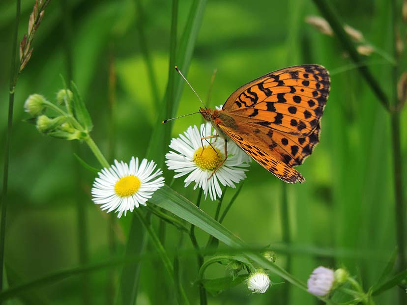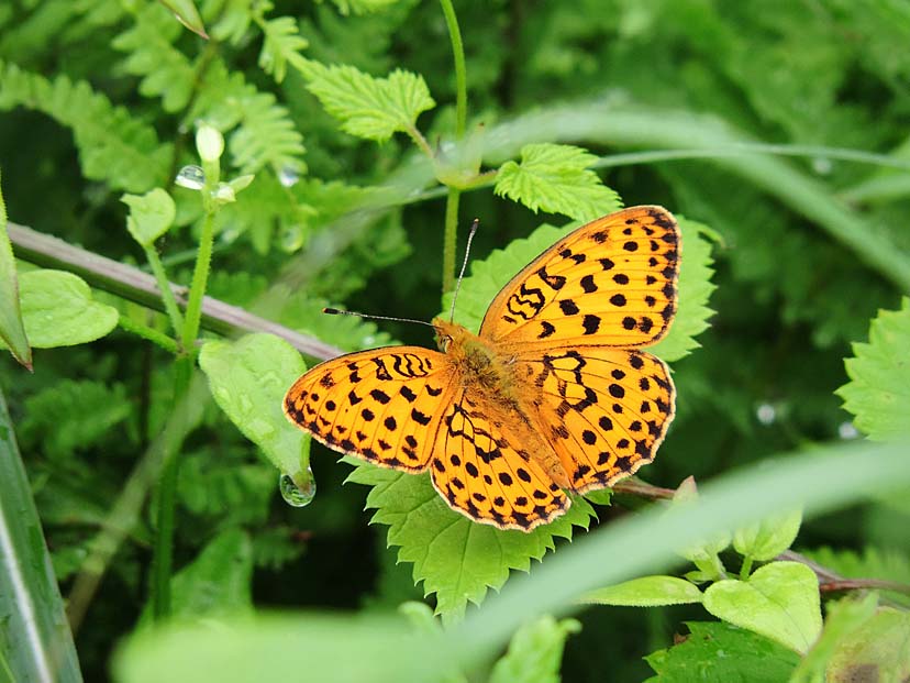 7月6日 今にも降りそうな空模様が回復しません。皆と蝶を探して歩きました。 ヒョウモンチョウ が、太陽が出て欲しいと待っているように翅を広げていました。従って、今日は特徴的な翅の裏側を見せてくれるようなことはありませんでした。